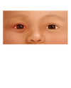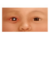 Photograph of a 2-month old boy with congenital syphilis showing erythematous macules and papules with some scaling in the upper chest. This bright red rash in this boy represents an early phase of the generalized rash with congenital syphilis; these lesions typically fade to a more copper or rust color.