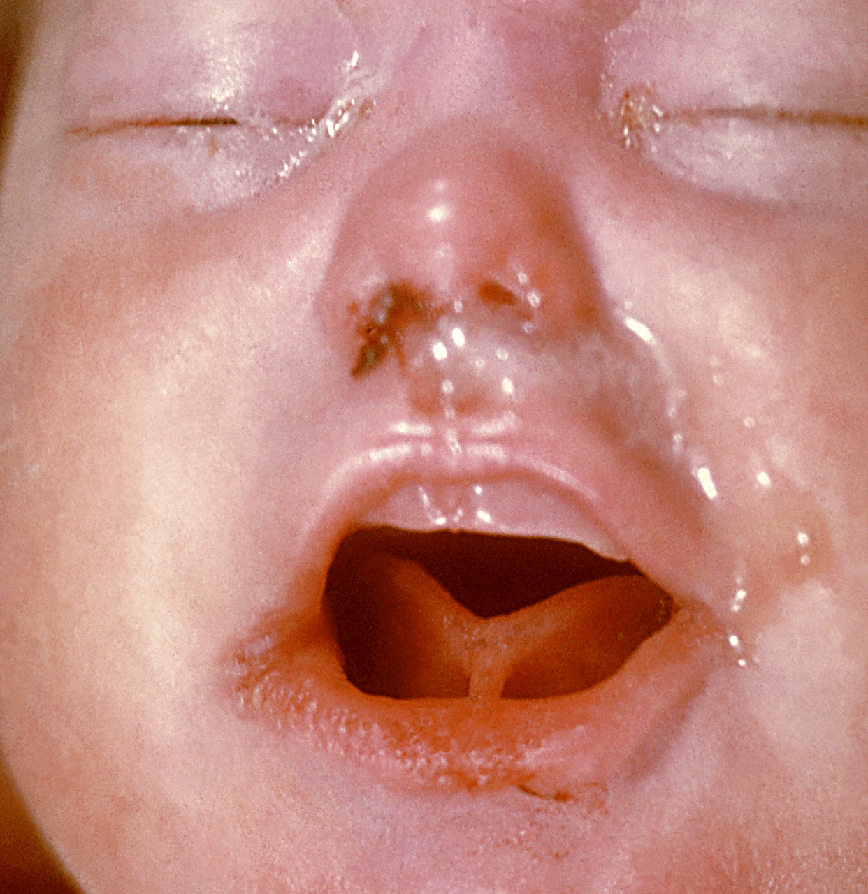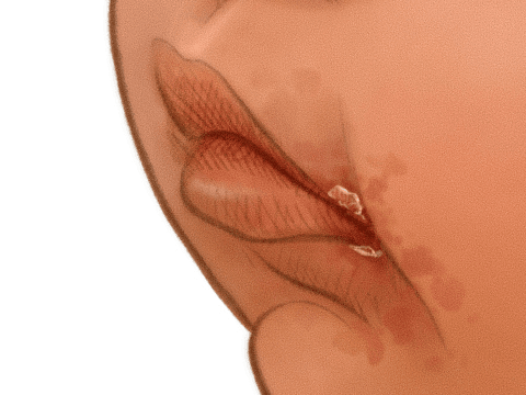 The congenital syphilis rash can involve the face; if so, it is usually concentrated at the corners of the mouth and nose, with crusting and cracking.