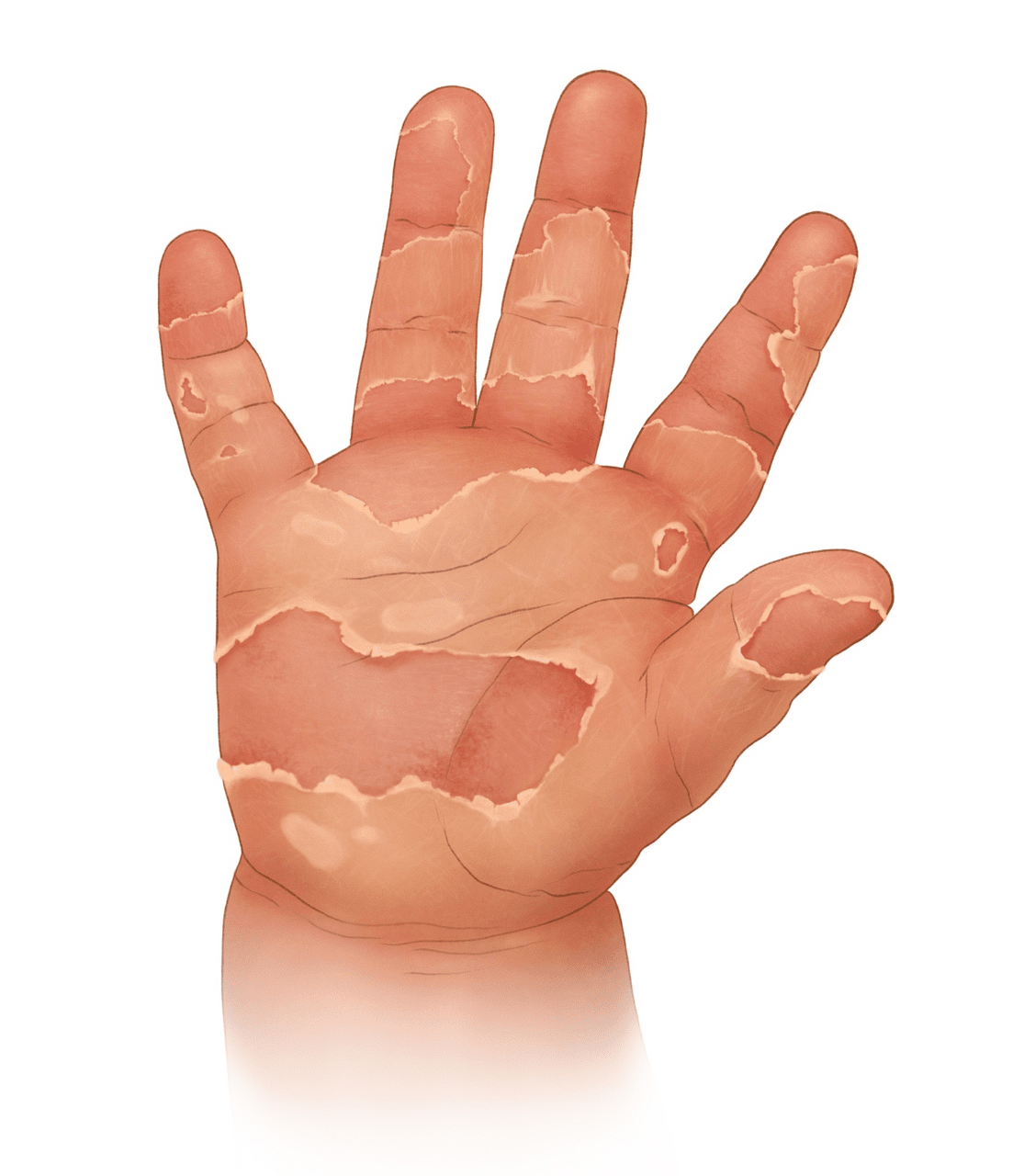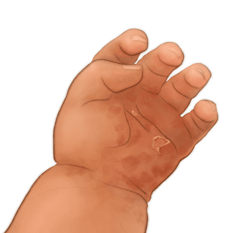 The rash associated with congenital syphilis often involves the soles and palms (as shown here on the palm of this infant’s right hand). The hand rash often becomes papular, followed by desquamation.
